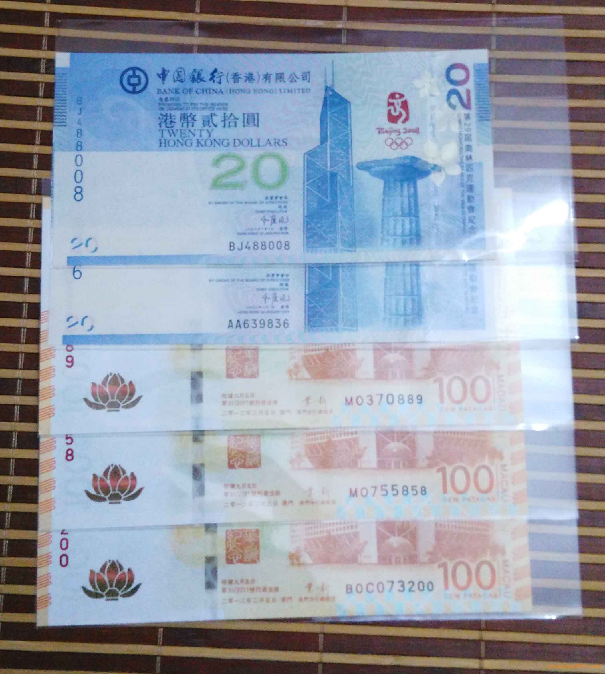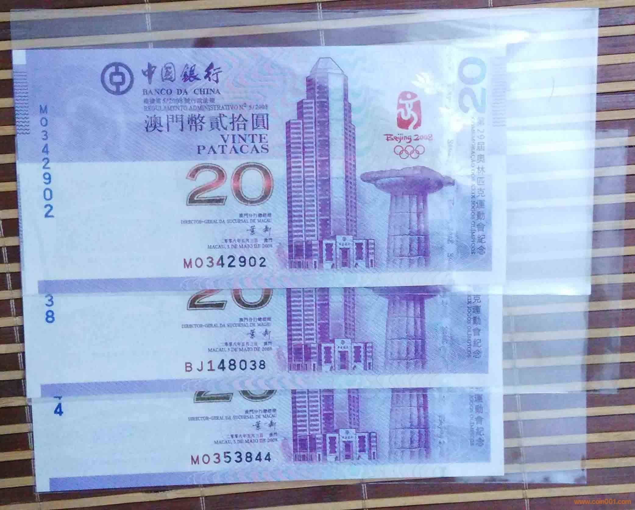 2)2008年澳門奧運鈔貳拾圓:MO,342902-BJ,148038-MO,353844,1360元X3張