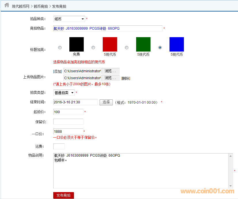 1. 會員可以在發(fā)起新拍賣帖時選擇加亮,也可以對正在進行中的拍賣貼加亮。