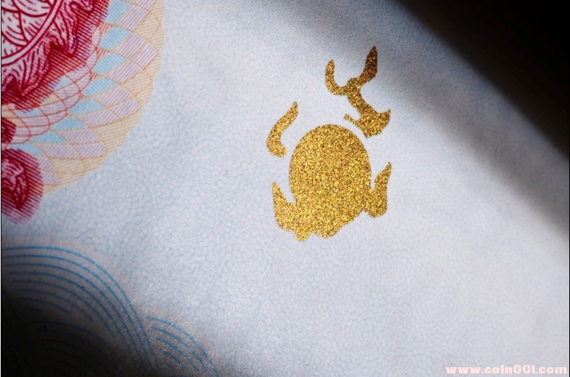 2、雙色凹印技術----正面的主景龍圖案和“壬辰”字樣采用紅色凹印油墨,左下側團花和“2012”字樣以及盲文點采用藍色凹印油墨。