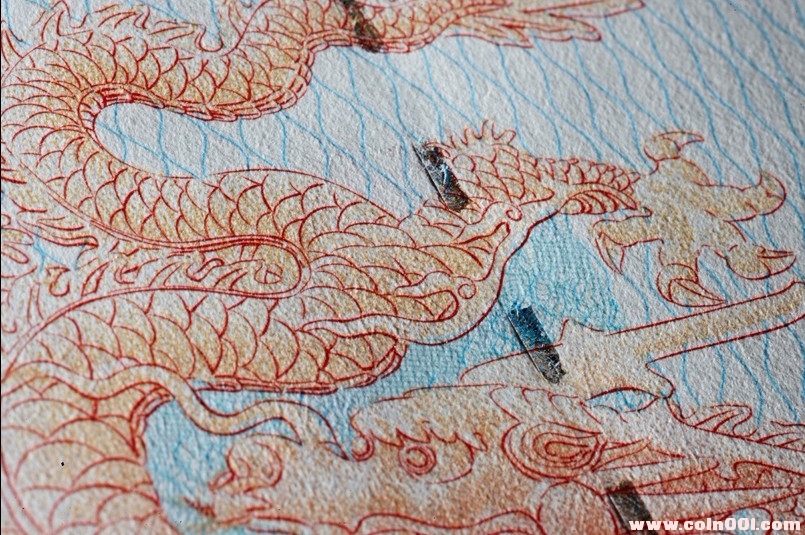 3、九種互補防偽功能區(qū)域組合:背面的九塊墻磚寓意九孔壁,同時又將底紋劃分為九塊區(qū)域,分別應用不同的防偽線紋技術,同時用“龍形玉佩”、“中國最古老的龍形象”、“甲骨文龍字”等各種圖案將不同區(qū)域有機連接。