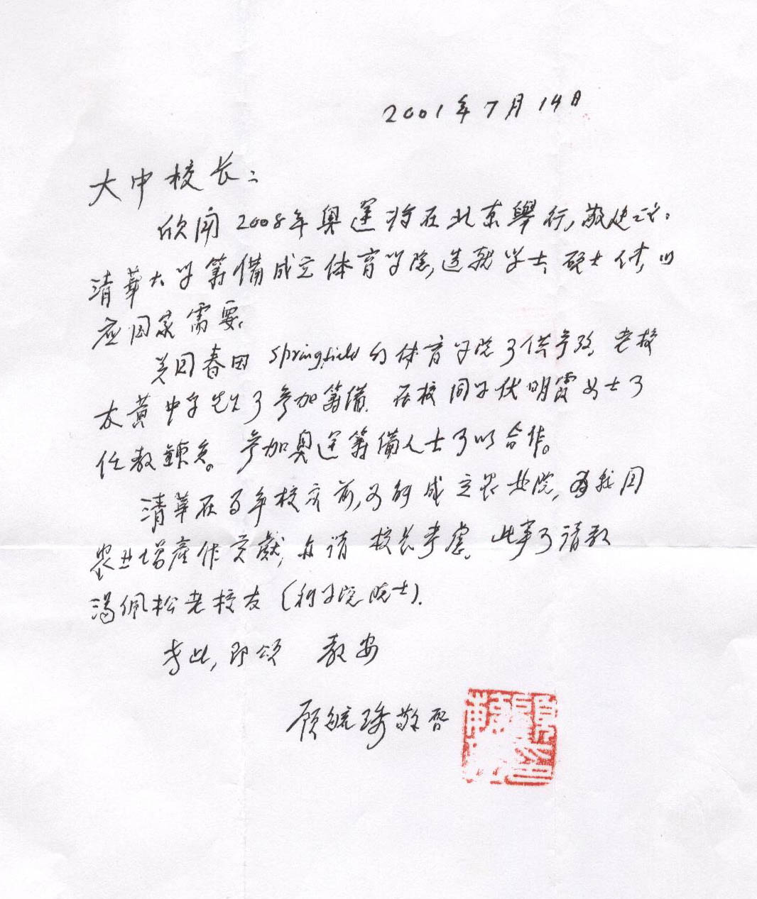這封信札是國學(xué)大師顧毓琇寫給清華校長關(guān)于為2008奧運(yùn)建議清華大學(xué)籌辦體育學(xué)院的建議,信札時(shí)間在2001年7月14日,是申奧成功第二天這位百歲國學(xué)大師激動之余的心情展現(xiàn)。這封信札應(yīng)當(dāng)是可以進(jìn)奧運(yùn)博物館的東東。