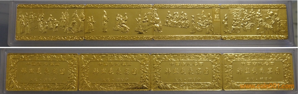 正面圖案將原畫(huà)分截為“聽(tīng)樂(lè)”“觀舞”“清吹”“散宴”四部分合成全畫(huà)整體。背面為主題文字,飾以花卉圖案。由工藝美術(shù)師-顧杏寶設(shè)計(jì)并雕刻,整版由四枚長(zhǎng)方形章組成,每枚尺寸:60*32毫米,四枚組成一幅完整的畫(huà)
