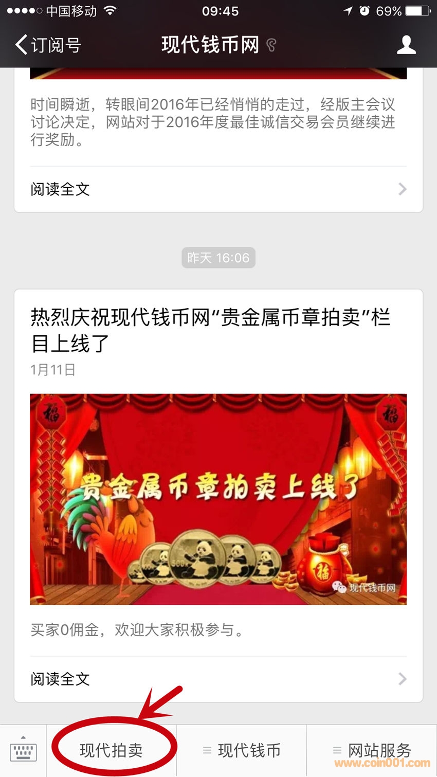 網(wǎng)站微信公眾號(hào),最近增加了新功能,就是將現(xiàn)代拍賣功能移植到網(wǎng)站微信公眾號(hào)中。進(jìn)入到網(wǎng)站微信公眾號(hào),點(diǎn)擊左下角“現(xiàn)代拍賣”。