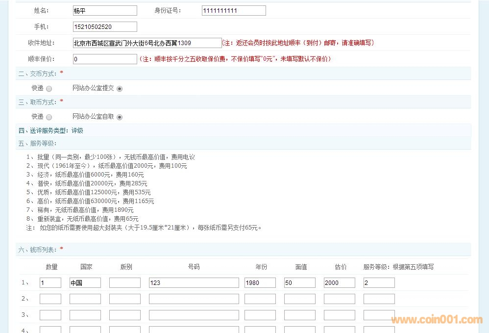 2)紙幣(1961年至今,市值2000元內的紙幣)。批量送評優(yōu)惠:1)一次送評錢幣(紙幣)滿50枚(張),品種不限,即享受評級費9折折扣。2)一次送評錢幣(紙幣)滿100枚(張),品種不限,即享受評級費8.5折折扣。3)贈送透明保護袋及藍色PCGS專用20枚幣盒。(注:折扣不再以贈送現代幣方式返還,而是直接從每枚評級費中折算,只收取折算后的評級費。)現代硬幣送評折扣前后收費標準