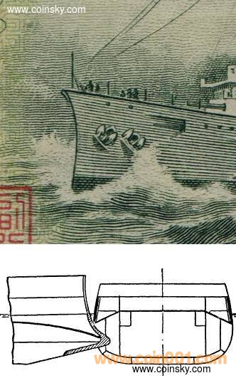 筆者在紙幣原圖上繪制的艦艏沖角: