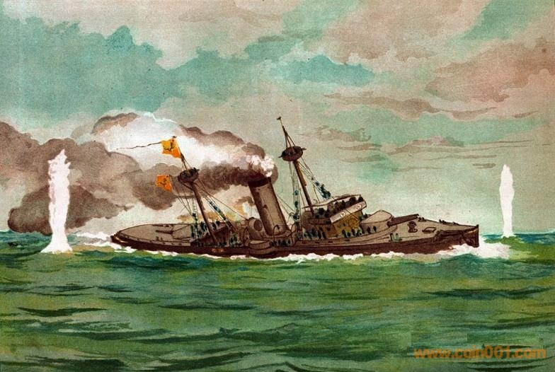 (致遠(yuǎn)艦嚴(yán)重傾斜即將沉沒~請注意吊艇架是空的,沒有救生艇。鄧世昌在開戰(zhàn)前已經(jīng)下令把救生艇全部扔掉了。)