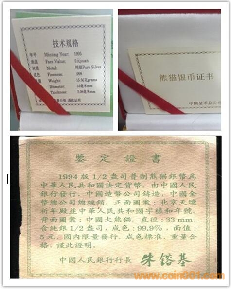 1993年裝幀套幣試驗(yàn)的失敗,金總決定不再推出1994年大熊貓銀銅套裝,直到1995年,郵幣卡市場行情轉(zhuǎn)暖,金總才小心翼翼地裝幀了5000套試銷,這5000套的證書,與1993年的證書系同一版本,只是略去了英文,聯(lián)系到1995年因?yàn)榕_(tái)海危機(jī)導(dǎo)致中國與最大的貿(mào)易伙伴國美國關(guān)系全面緊張,1995年的熊貓銀銅幣套裝縮量裝幀不標(biāo)注英文合乎情理。1996年,郵幣卡市場行情全面啟動(dòng),金總清點(diǎn)庫房,發(fā)現(xiàn)庫房里還有大量的1993年1/2盎司熊貓銀幣,于是決定,將庫存的1993年版熊貓銀銅幣全部裝幀,在各門市部上柜出售。兩次裝幀的總量之和,應(yīng)該是100000套。金總決定擴(kuò)大裝幀量后,因?yàn)樾碌淖C書來不及印制,便把原先的證書上的“10,000”之后添一個(gè)“0”臨時(shí)過渡。湊合用了一陣后,可能金總覺得這樣不夠嚴(yán)肅,也不便于管理,于是要求各門市部將原有的證書統(tǒng)一收回,按照原先編號(hào)換發(fā)新的證書,于是世面上就出現(xiàn)了手工添加“0”的老證和重新印制加“0”的新證。需要說明的是,新證上的“10,0000”也是不符合規(guī)范的,正確的寫法應(yīng)該是“100,000”。