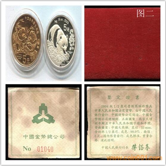 二、關(guān)注 從老馮這里買到的這套大熊貓銀銅紀(jì)念幣,是裝在一個(gè)紅底藍(lán)面的絨盒中的。紅色底座上的兩處圓形的嵌座,各放一枚1993年的大熊貓5元面值銅質(zhì)流通紀(jì)念幣和1993年5元面值的熊貓1/2盎司的銀幣。綠色的硬紙證書上標(biāo)明,這種套裝的裝幀量為100000套。絨盒外還有一個(gè)白色的紙?zhí)祝執(zhí)咨鲜菭C金的中國人民銀行行標(biāo)和中英文的中國金幣總公司。值得注意的是,白色紙?zhí)缀途G色證書上的中文,均為繁體字,而絨盒內(nèi)頁上的中文,則是國內(nèi)通用的簡體字。