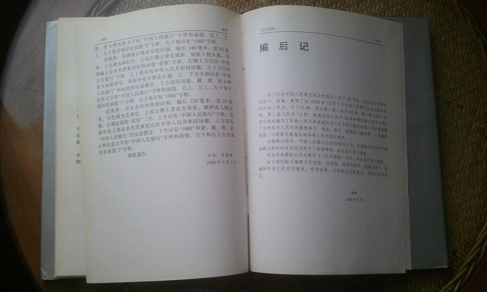 人民幣圖冊 書名由陳云題寫,央行貨幣發(fā)行司編,中國金融出版社1988年出版,此為92年05月第三次印刷。此書是為了紀念央行成立40周年和人民幣發(fā)行40周年而編,是央行第一本比較完整系統(tǒng)介紹人民幣(個別金銀幣)的工具書。其價值還表現(xiàn)在書中收集了部分人民幣發(fā)行令、通告、布告等文獻資料。