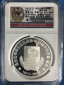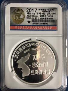 12.全新 2017年 朝鮮-祖國統(tǒng)一三大憲章頒布45周年 紀念銀幣 31g999純銀