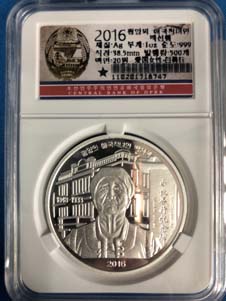 18.全新 2016年 朝鮮-愛國慈善家-白善行-暨白善行紀念館復(fù)碑10周年 紀念銀幣 1oz999純銀