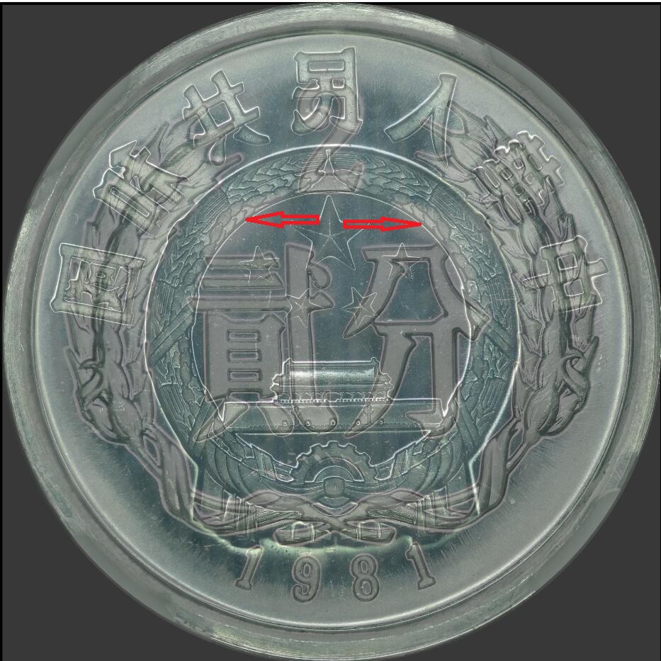 3. “透打部分即描邊內(nèi)部常常是幣的鏡面效果保留最好的部分,這也更引導(dǎo)我們視覺(jué)上區(qū)分出透打,分幣和長(zhǎng)城角幣整個(gè)幣已經(jīng)出現(xiàn)車(chē)輪光的情況下,這個(gè)正對(duì)著對(duì)面國(guó)徽的部分還往往保留著鏡面”