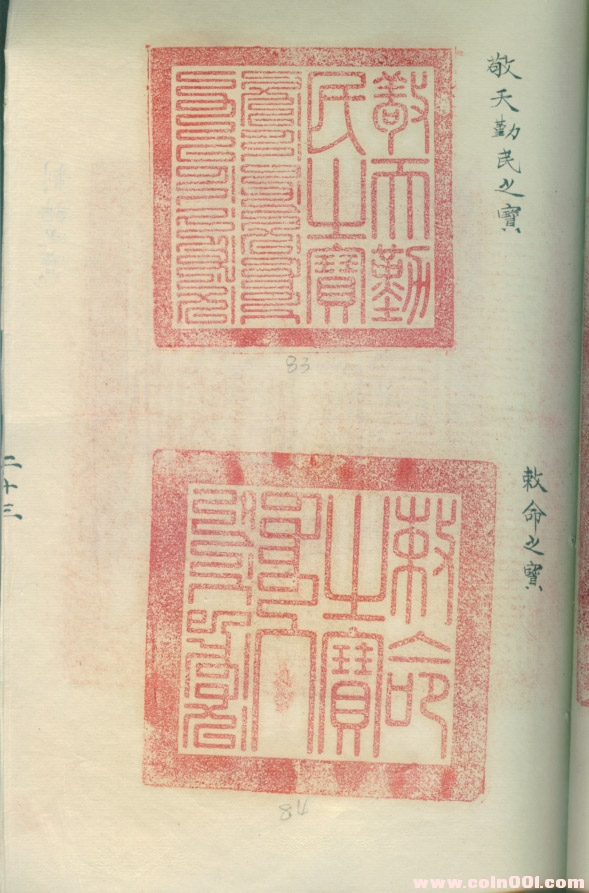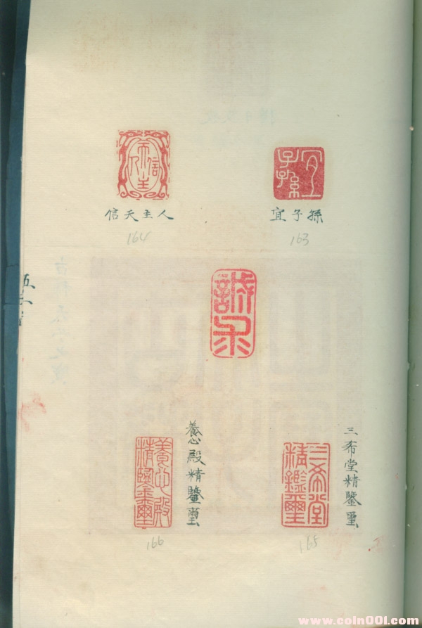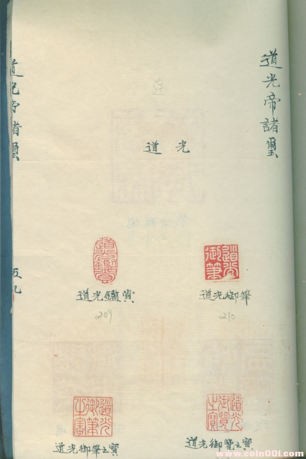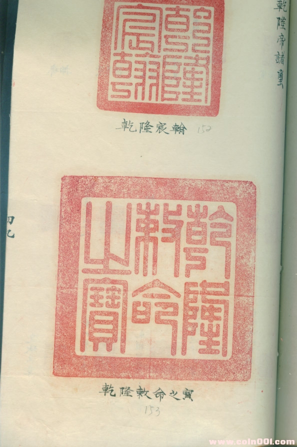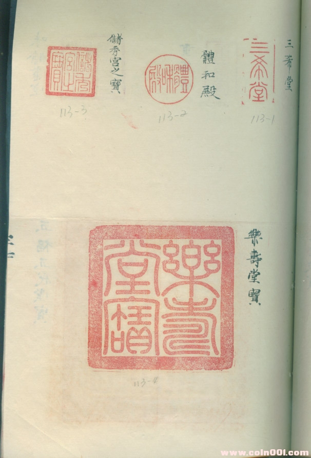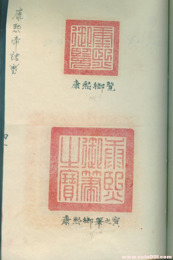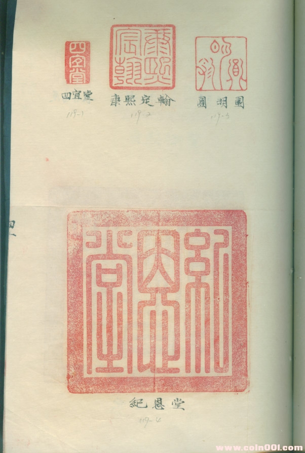 全印譜內容為明清帝后寶璽。其分類如下: 明代國寶璽印 55 枚; 道錄青詞鈐印諸璽 25 枚; 清代寶璽 37 枚; 宮殿名璽 40 枚; 康熙諸璽 24 枚; 雍正諸璽 25 枚; 乾隆諸璽 40 枚; 嘉慶諸璽 33 枚; 道光諸璽 9 枚; 咸豐諸璽 11 枚; 同治諸璽 10 枚; 光緒諸璽 7 枚 ;宣統(tǒng)諸璽 6 枚; 皇后嬪妃諸印 37 枚; 共計 359 個印文。其中著名的“清二十五寶”全部涵蓋,所鈐印與故宮博物院網(wǎng)上公布的尺寸一樣,均為明清帝后寶璽原鈐。另印鑒下均有手書文字釋文。毛筆小楷,字跡雅致,剛勁有力,十分罕見,具有非常重要的收藏價值。是研究書畫、印鑒的朋友們應該特別關注的精品。