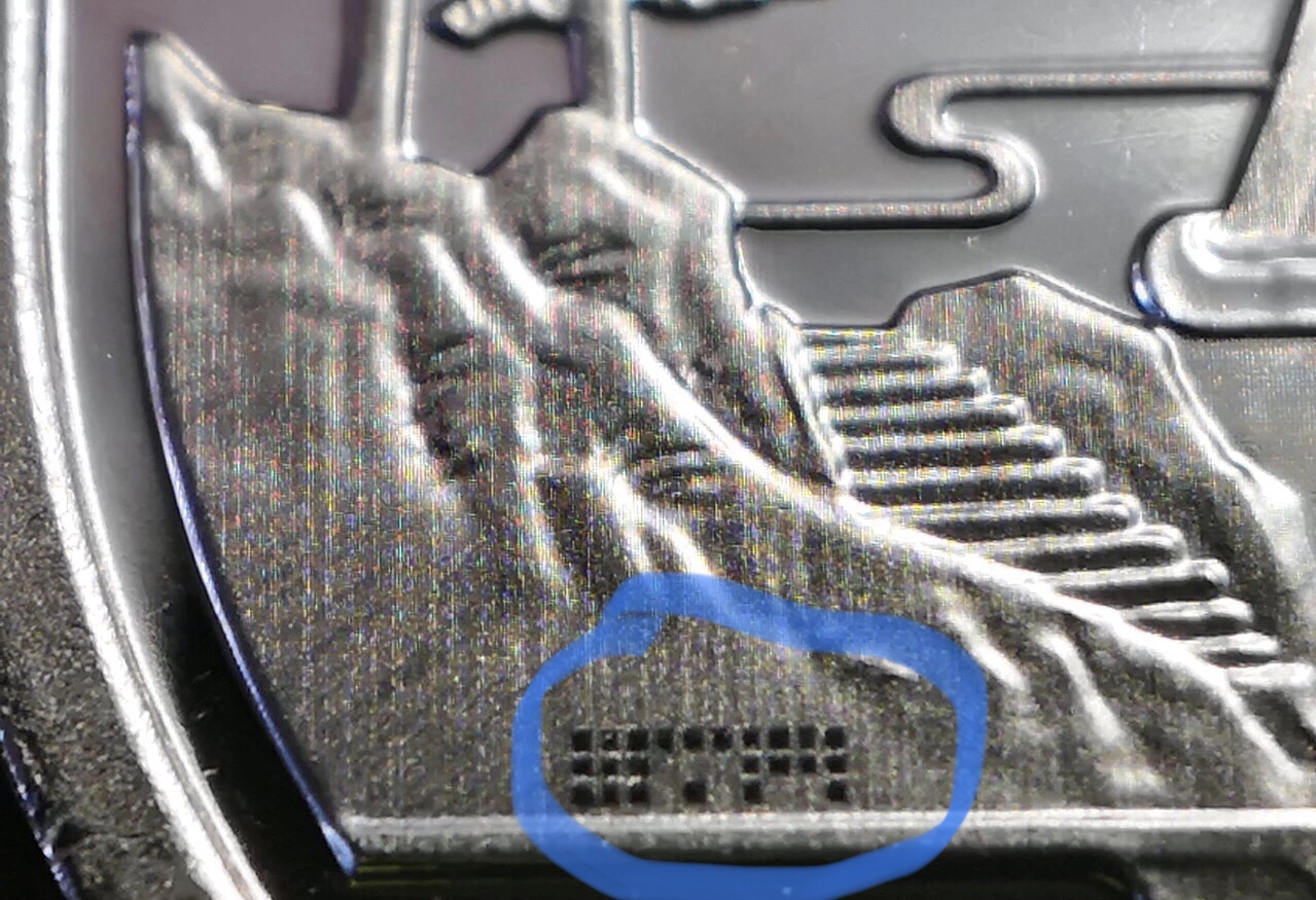 這個(gè)應(yīng)該是給機(jī)器識(shí)別的點(diǎn)陣,不同造幣廠有不同的點(diǎn)陣。好像南京的比沈陽的少1點(diǎn)。