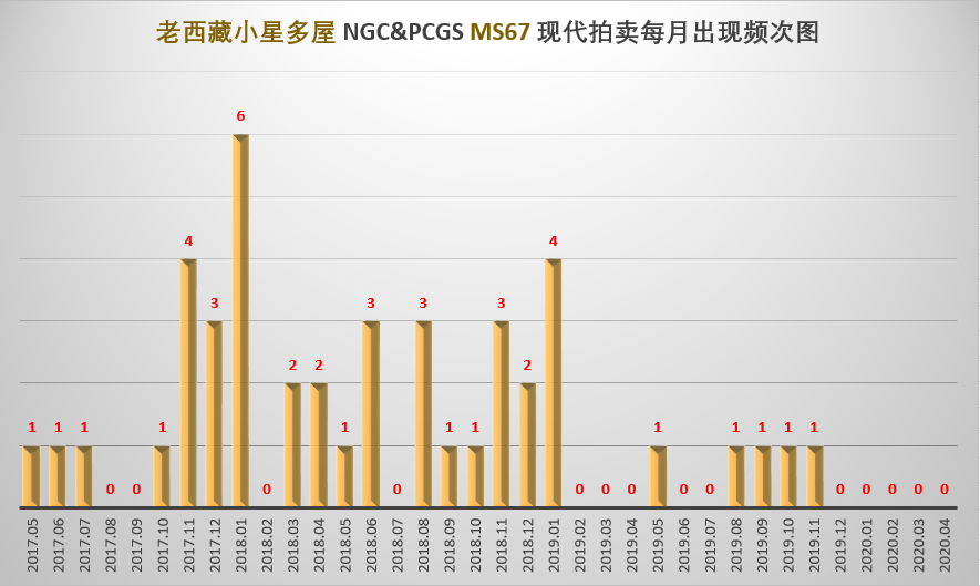 好了,轉(zhuǎn)眼間到了人艱不拆的2019年。2019年大家要么被套惜售,要么徹底對(duì)小星多屋的行情喪失了信心,2019年全年拍賣(mài)了9枚,量?jī)r(jià)齊降。而且自2019年11月后,網(wǎng)站上至今沒(méi)有一枚MS67的小星多屋出現(xiàn),2020年已經(jīng)看不到了!等于半年沒(méi)出現(xiàn)了。
