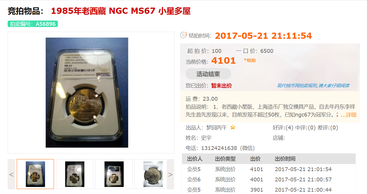 由于目前小屋多星在NGC和PCGS的記錄中最高分為MS67,下面就以67分為例,進(jìn)行分析。在翻閱了拍賣(mài)紀(jì)錄后,發(fā)現(xiàn)67分首次拍賣(mài)是在2017年5月7日上拍,2017年5月21日結(jié)拍,最終拍價(jià)為