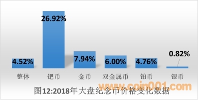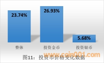 如圖11所示,在2018年大盤的投資幣中,市場交易價格整體上漲23.74%。其中投資金幣上漲26.93%,投資銀幣上漲5.68%。