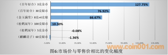 如圖6所示,與零售價相比,在“2020吉祥文化金銀紀念幣”的6個幣種中,到6月底呈現(xiàn)漲跌互現(xiàn)格局。其中(百年好合)的3克金幣和30克銀幣以及(金玉滿堂)雙金屬幣的漲幅不??;(麒麟送子)60克銀幣和(松鶴延年)5克金幣跌破零售價。