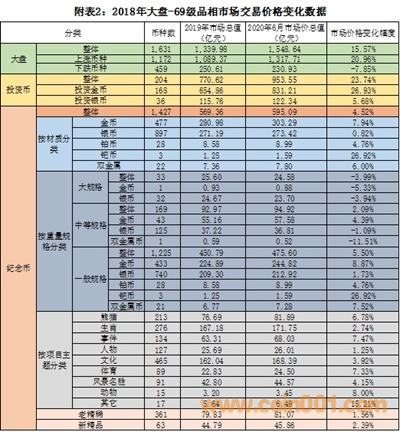1979年至2018年發(fā)行項目的集合簡稱2018年大盤。為簡化起見和從代表性出發(fā),以下披露2018年大盤市場交易價格的變化將以69級品相為基點。到2020年6月底,69級品相幣種與2019年底有對應價格的幣種共計1631種,占同期貴金屬幣總數(shù)的71.25%。2018年大盤的匯總數(shù)據(jù)見附表2。