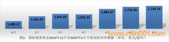 如圖2所示,國際黃金價格延續(xù)2019年中期開始的震蕩上行走勢繼續(xù)攀升,2020年6月加權(quán)均價報1734.70(美元/盎司),與2019年12月的加權(quán)均價相比上漲17.20%。