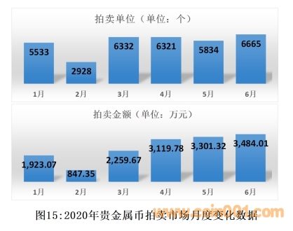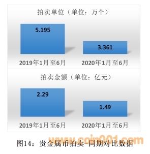 與2019年同期相比,2020年上半年我國貴金屬幣拍賣的數(shù)量和金額數(shù)據(jù)見圖14。