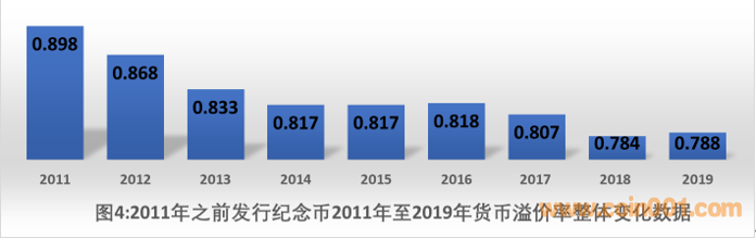 如圖4所示,在我國(guó)金幣市場(chǎng)的這次熊市調(diào)整中,2011年之前發(fā)行的貴金屬紀(jì)念幣,其貨幣溢價(jià)率也確實(shí)處于下行狀態(tài),從2011年高點(diǎn)的0.898下降到2019年的0.788,但整體下降幅度僅為12.26%,大大低于“特定研究區(qū)間”板塊貨幣溢價(jià)率的下降幅度。數(shù)據(jù)說(shuō)明,“特定研究區(qū)間”板塊交易價(jià)格的大幅下行,除去受到金幣市場(chǎng)的熊市影響外,應(yīng)該還有自身的獨(dú)特原因。