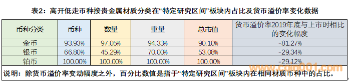 如表2所示,按貴金屬材質(zhì)分類(lèi),不同材質(zhì)幣種的“高開(kāi)低走”狀況是不同的:①在各種數(shù)量指標(biāo)中,金幣大幅度高于銀幣。說(shuō)明在這個(gè)板塊內(nèi),引發(fā)“高開(kāi)低走”的主要?jiǎng)恿κ墙饚?。②從貨幣溢價(jià)率指標(biāo)的變化看,也是金幣的指標(biāo)大大高于“高開(kāi)低走”幣種的整體數(shù)值,而銀幣的貨幣溢價(jià)率變化值相對(duì)較低。③其中的鉑金幣僅為一種,是“2019年中國(guó)北京世界園藝博覽會(huì)貴金屬紀(jì)念幣”中的3克鉑金幣,它上市后的交易價(jià)格走勢(shì)眾人皆知。