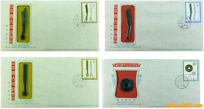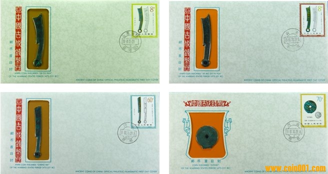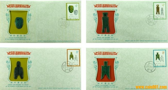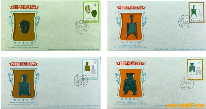 ????1981年至1982年我國(guó)發(fā)行了一套"中國(guó)古代錢幣"郵票,全套16枚,分兩次發(fā)行,同時(shí)中國(guó)郵票總公司發(fā)行了一套郵幣封。信封右上角貼一枚"中國(guó)古代錢幣"郵票,信封左側(cè)鑲嵌著一枚古錢幣仿制品。每枚封所貼的郵票上部銷印有該錢幣的出土地點(diǎn)和曾經(jīng)流通使用過的地區(qū)的郵政地名郵戳戳記,各枚封的背面均印有該枚古錢幣的說明,這是我國(guó)發(fā)行的首套仿古錢幣鑲嵌封。這套郵幣封曾獲美國(guó)錢幣家協(xié)會(huì)1983年年度獎(jiǎng)。