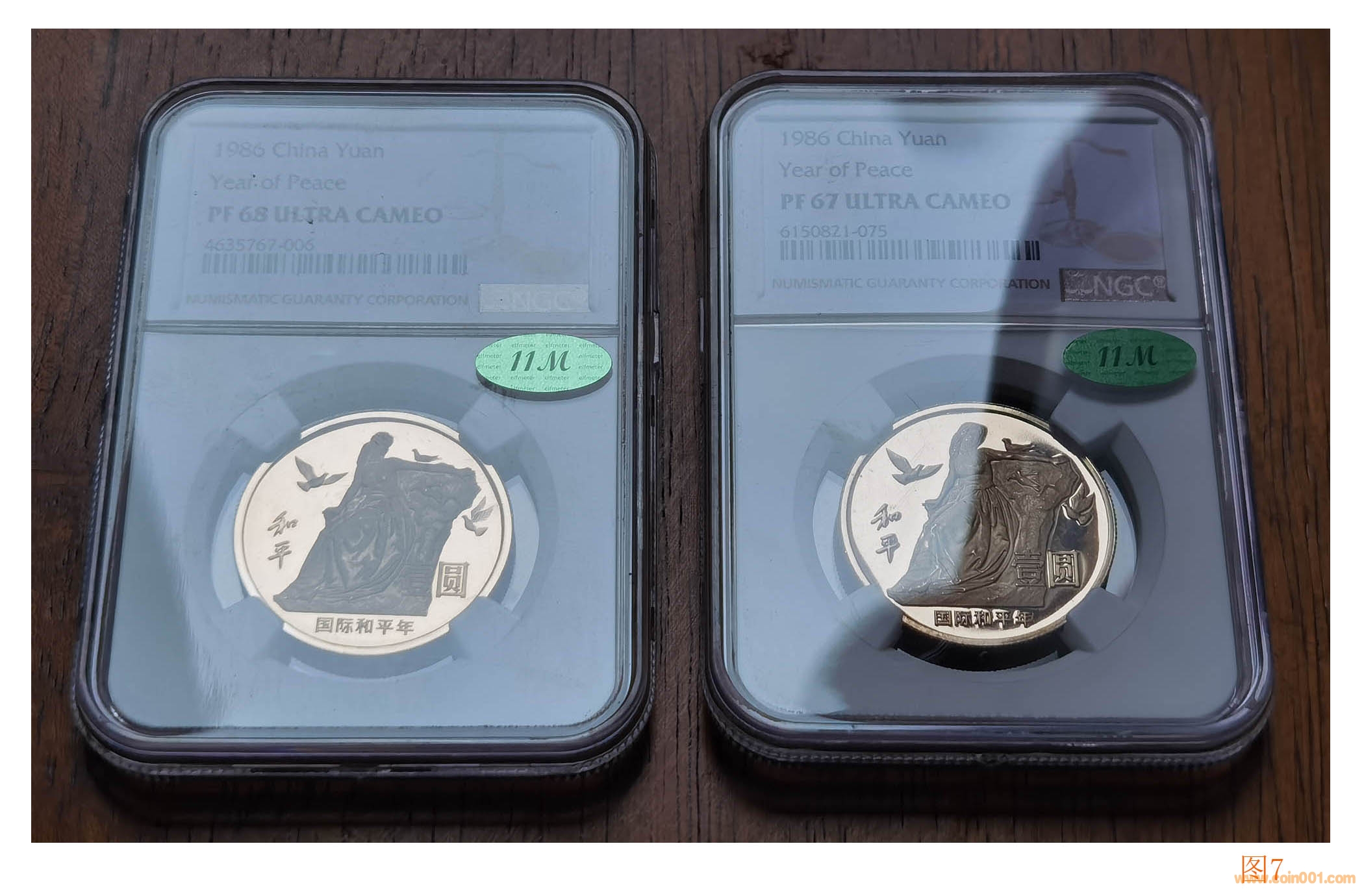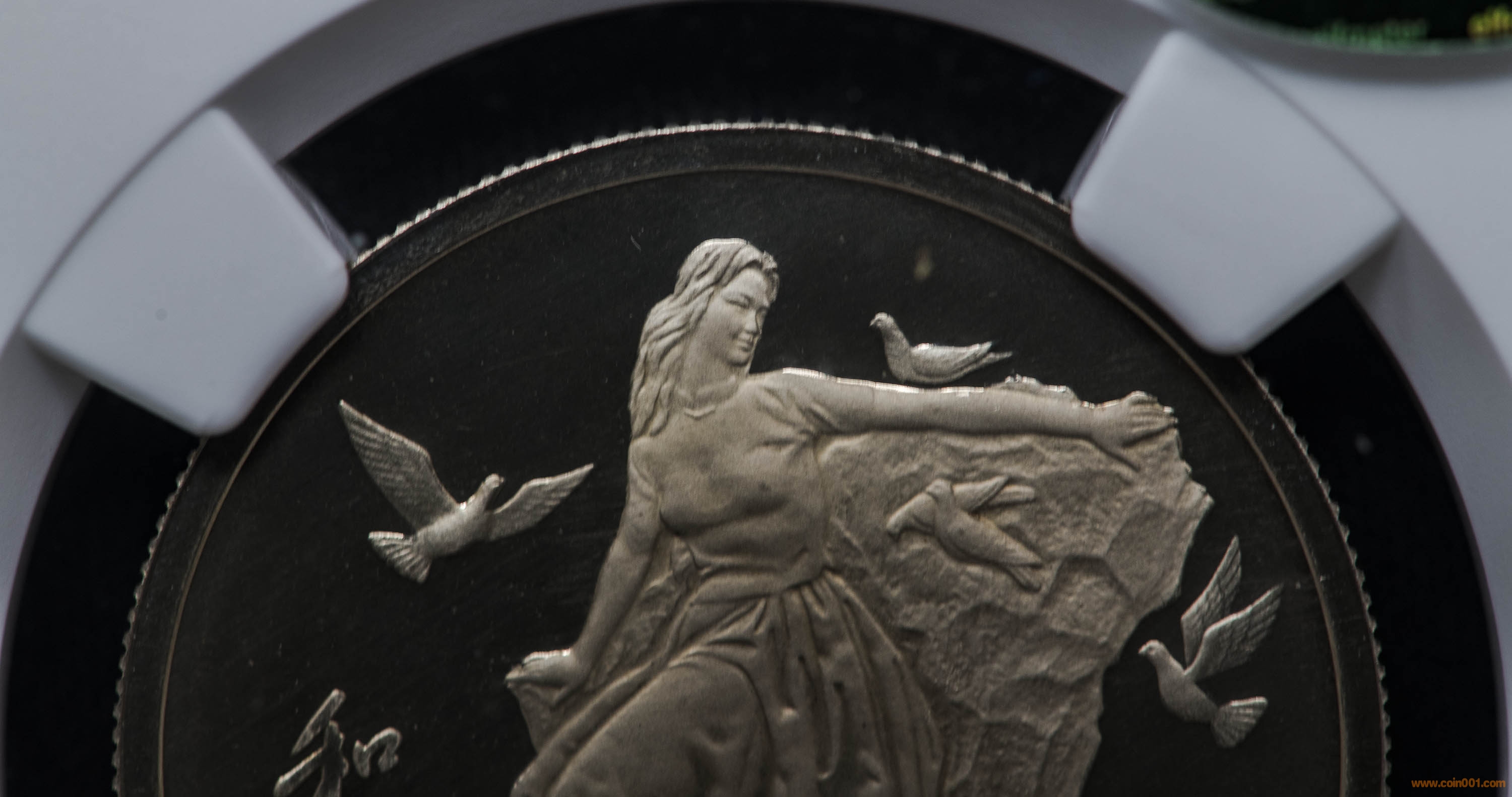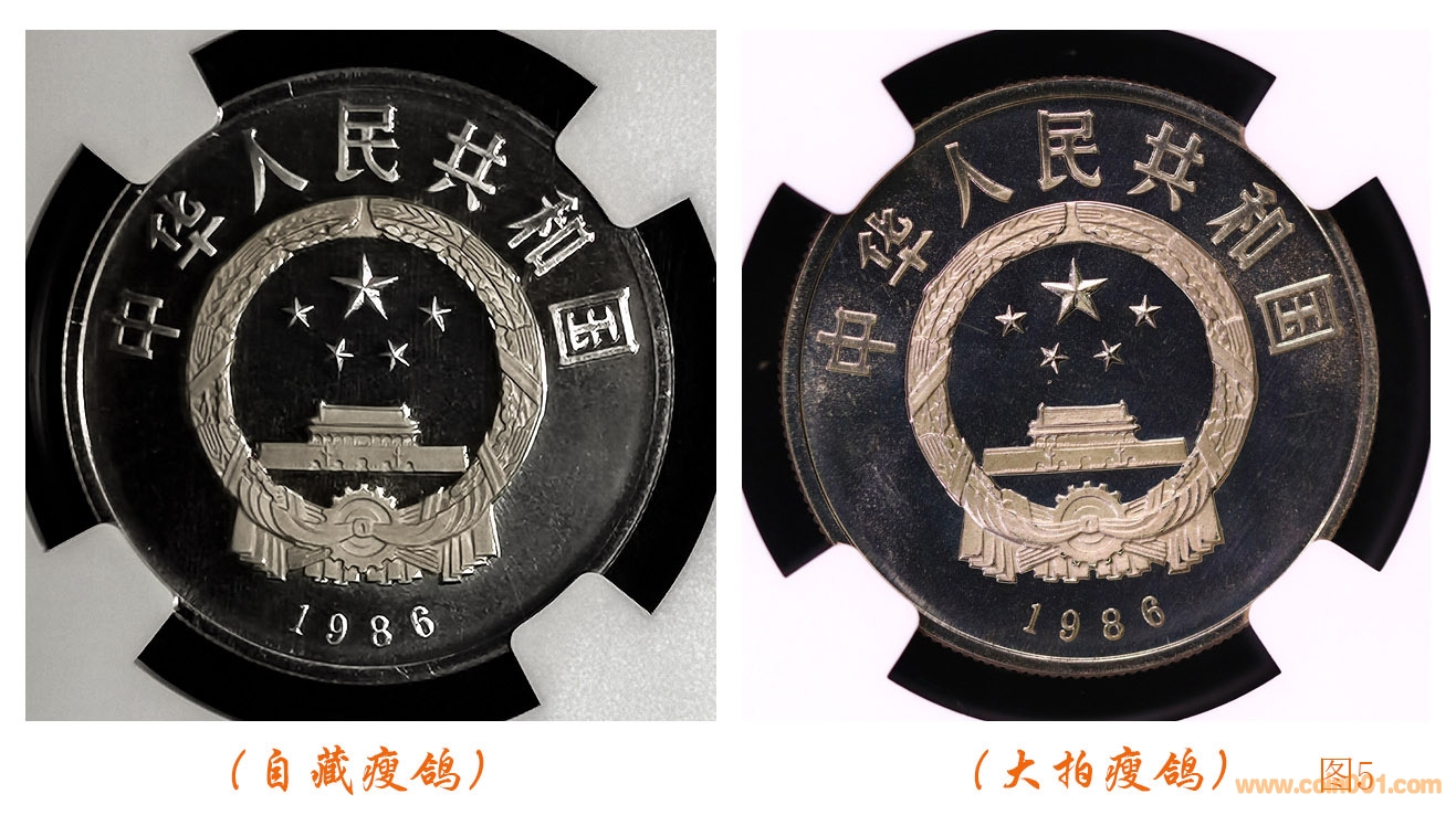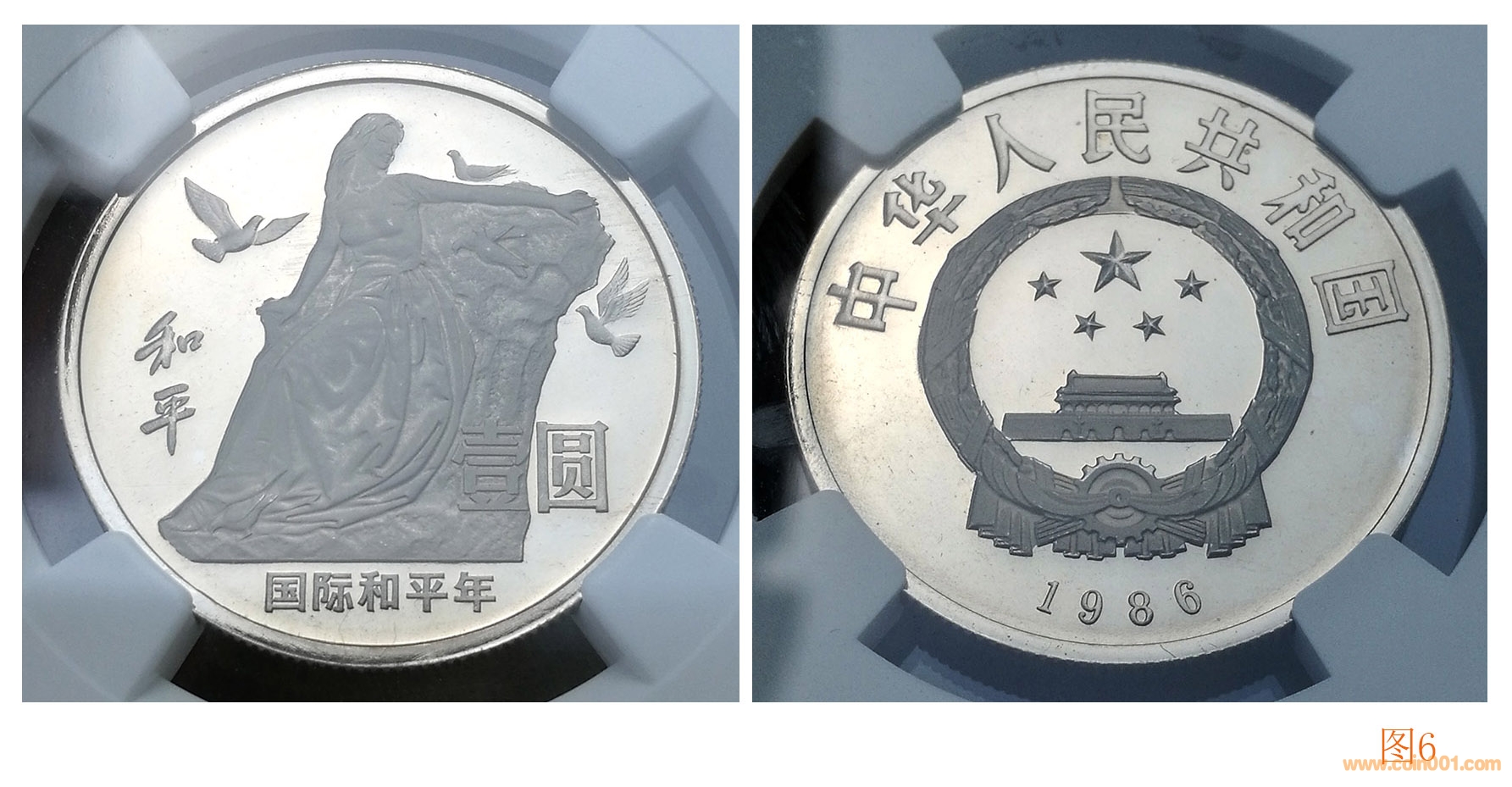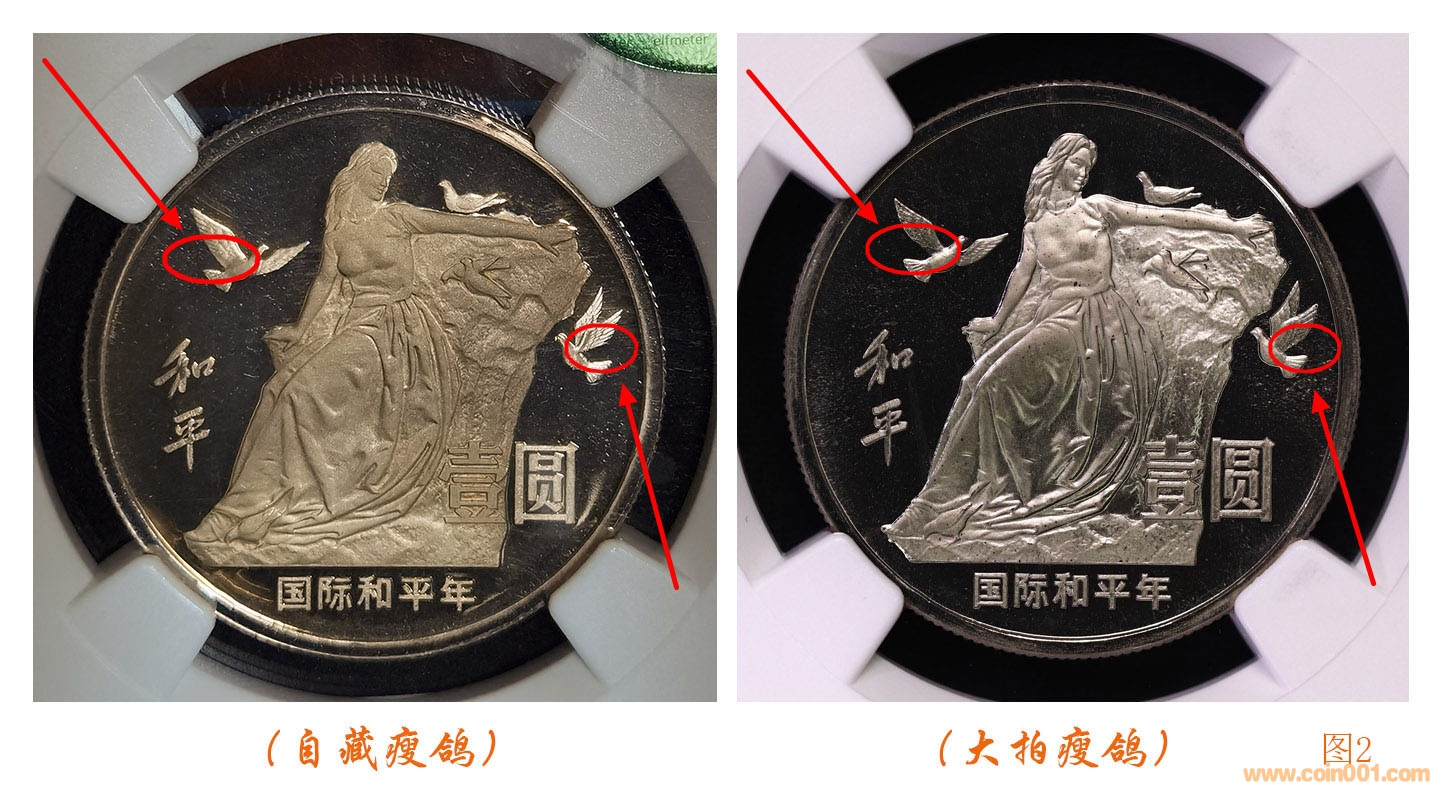中國人民銀行1986年發(fā)行的流通紀念幣國際和平年2704.8萬枚,其中精制紀念幣較稀少,是早期精制紀念幣精品,共分3個版別:肥鴿版、瘦鴿版、薄噴砂版。201811月偶得一枚瘦鴿版,這枚瘦鴿版噴砂厚重、均勻,滿噴砂(幾乎無漏砂),鏡面光潔,幾乎無閃光性損傷,噴砂鏡面對比強烈,精制度較高,與一般精制度的和平年有本質(zhì)的視覺差異(見圖1。