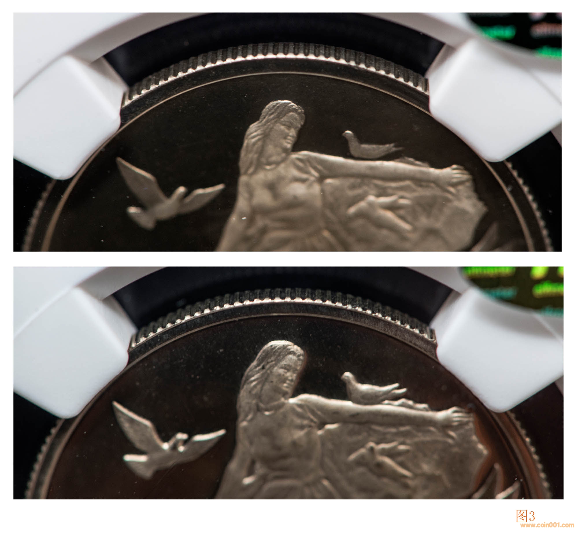 20221月春節(jié)前,在與泉友交流中,有眼尖泉友明確指出,這枚高精制度瘦鴿與其他精制瘦鴿明顯不同,他這一提醒,我連忙找出近幾期現(xiàn)代錢幣網(wǎng)春秋大拍的精制瘦鴿對比,經(jīng)仔細觀察,果不其然,幣面鴿子翅膀形態(tài)與大拍的幾枚精制瘦鴿有所區(qū)別。主要區(qū)別有兩處(見圖2):左邊鴿子翅膀與鴿身連接處向下靠鴿尾,顯得鴿子翅膀根部較寬、較肥;右邊鴿子翅膀與鴿身連接處離鴿尾稍遠,顯得鴿子翅膀根部較窄、較瘦。這一發(fā)現(xiàn)令我很納悶了,這是怎么回事兒呢?連忙聯(lián)系在同一時段、在同一賣家購得另一枚高精制度瘦鴿的北京泉友,結(jié)果他的瘦鴿與現(xiàn)代錢幣網(wǎng)大拍以及其他收藏者手中的瘦鴿特征完全相同!