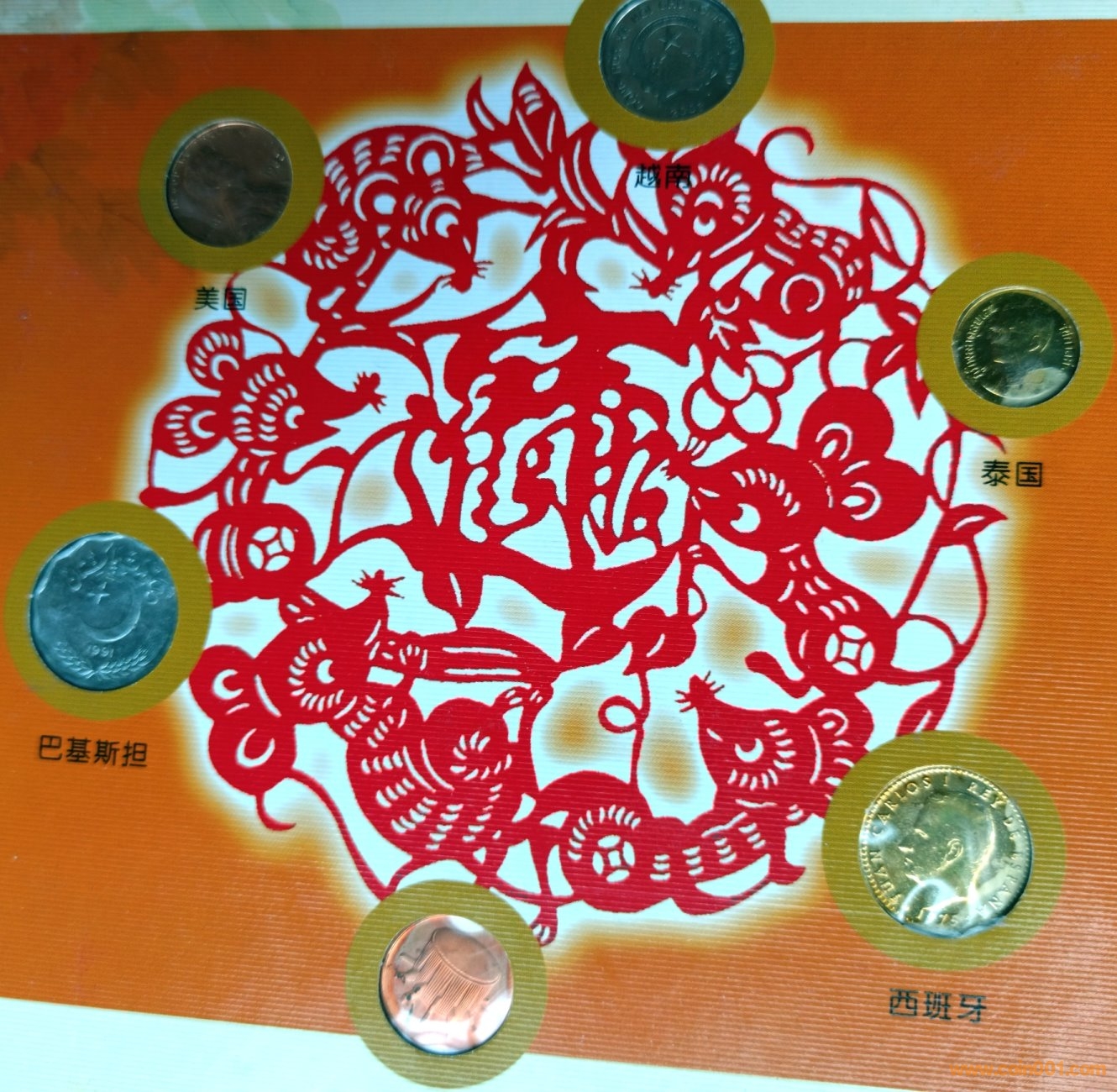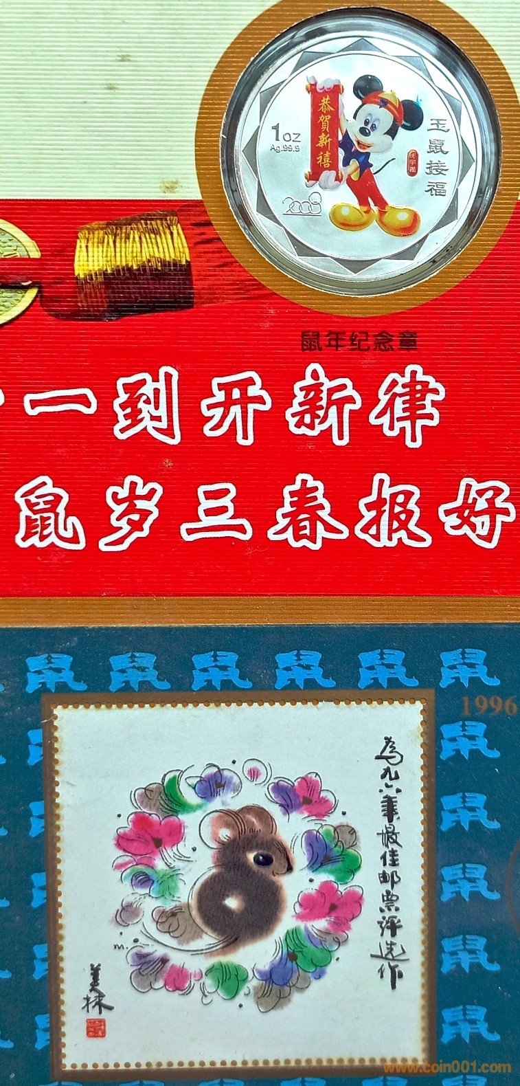 首頁是個1OZ Ag99.9的"玉鼠接福"鼠年紀念章和一張1996年的鼠年紀念張郵票。