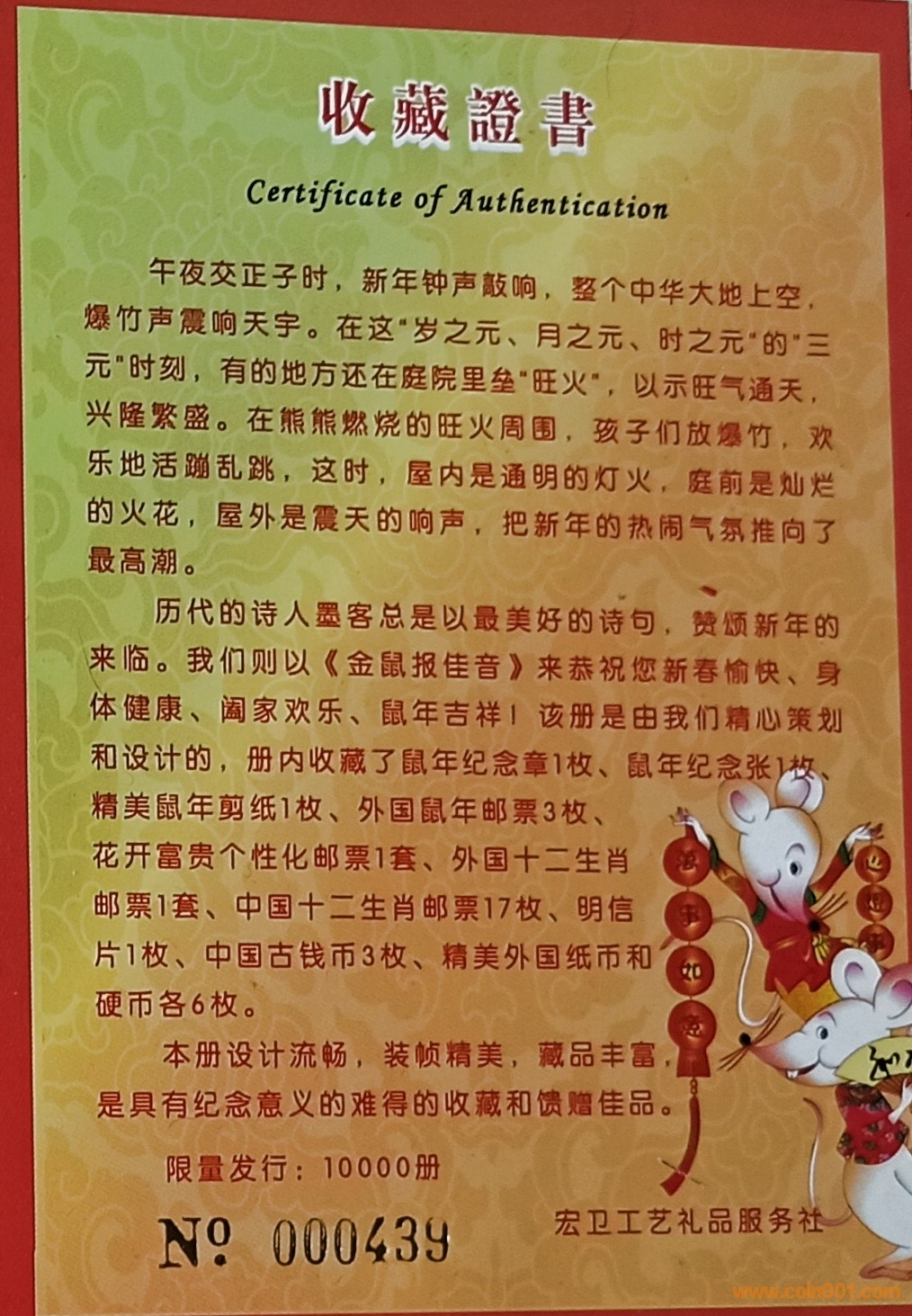這紀念冊是2008年鼠年定制的紀念冊,共一萬套,我這冊編號00439,收藏證書如下: