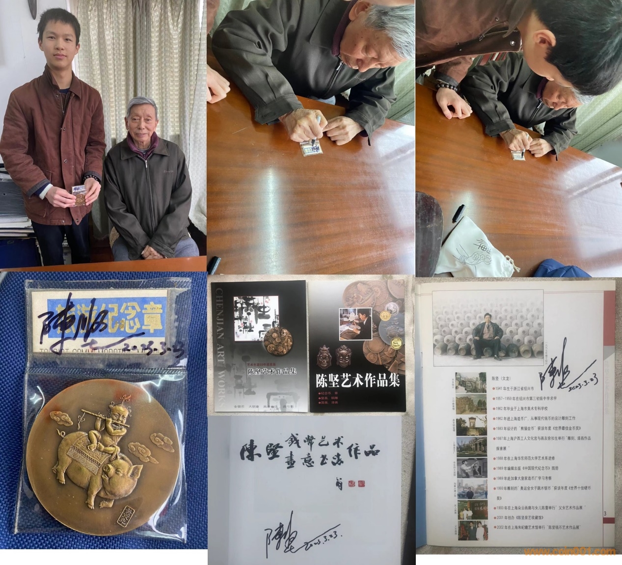 在春拍剛上線時(shí),我就迫不及待的出價(jià)了大銅章名品——《小放豬》,然后會(huì)員二·,也就是我爸出了價(jià),后來發(fā)現(xiàn)小放豬搶的好猛,結(jié)拍前幾個(gè)小時(shí)價(jià)格就已經(jīng)到了28000,但我爸爸直接出到三萬,我由于太激動(dòng),又加了一千。拍下后我爸告訴我,如果這枚豬超過三萬他就不要了,買下來是因?yàn)樗胍獛胰リ悎?jiān)老師家,請(qǐng)他簽名,還要請(qǐng)陳老師拿著這枚簽名的《小放豬》和我拍一張照片,后來陳堅(jiān)老師還送了我兩本他簽名的《陳堅(jiān)作品回憶錄》。枚《小放豬》和這兩本書都是我的終生收藏。