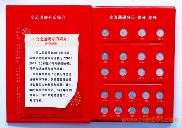 大全套收錄了1955-2018年期間,中國人民銀行公開等面值發(fā)行并投放流通領(lǐng)域的全部流通硬分幣78枚(簡稱“全流通硬分幣”,不包括溢價(jià)發(fā)行的“五大天王”和1992年壹分、貳分等裝禎套幣中的硬分幣,更不存在改刻幣或“留空洞”的現(xiàn)象)。