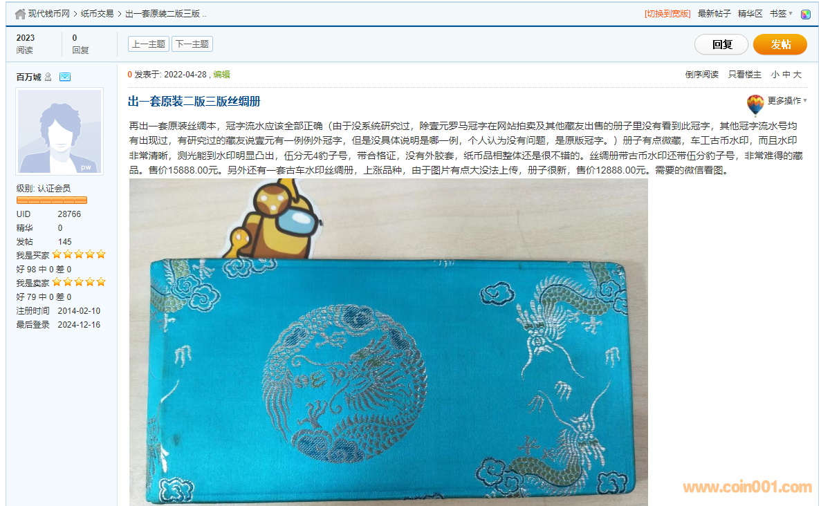 錦緞冊冠號古幣水?、颌?,號段區(qū)間0412(未發(fā)現(xiàn)04120),另外還發(fā)現(xiàn)04115,04130,04131,04132(原裝與否,有待檢驗)