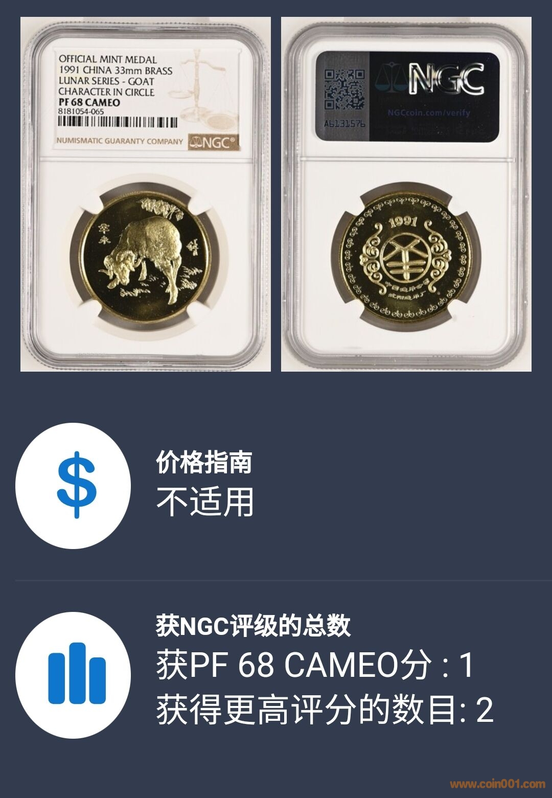 1991年羊年生肖銅章33mm,NGC PF68,亞軍分,更高分僅2枚  -480元