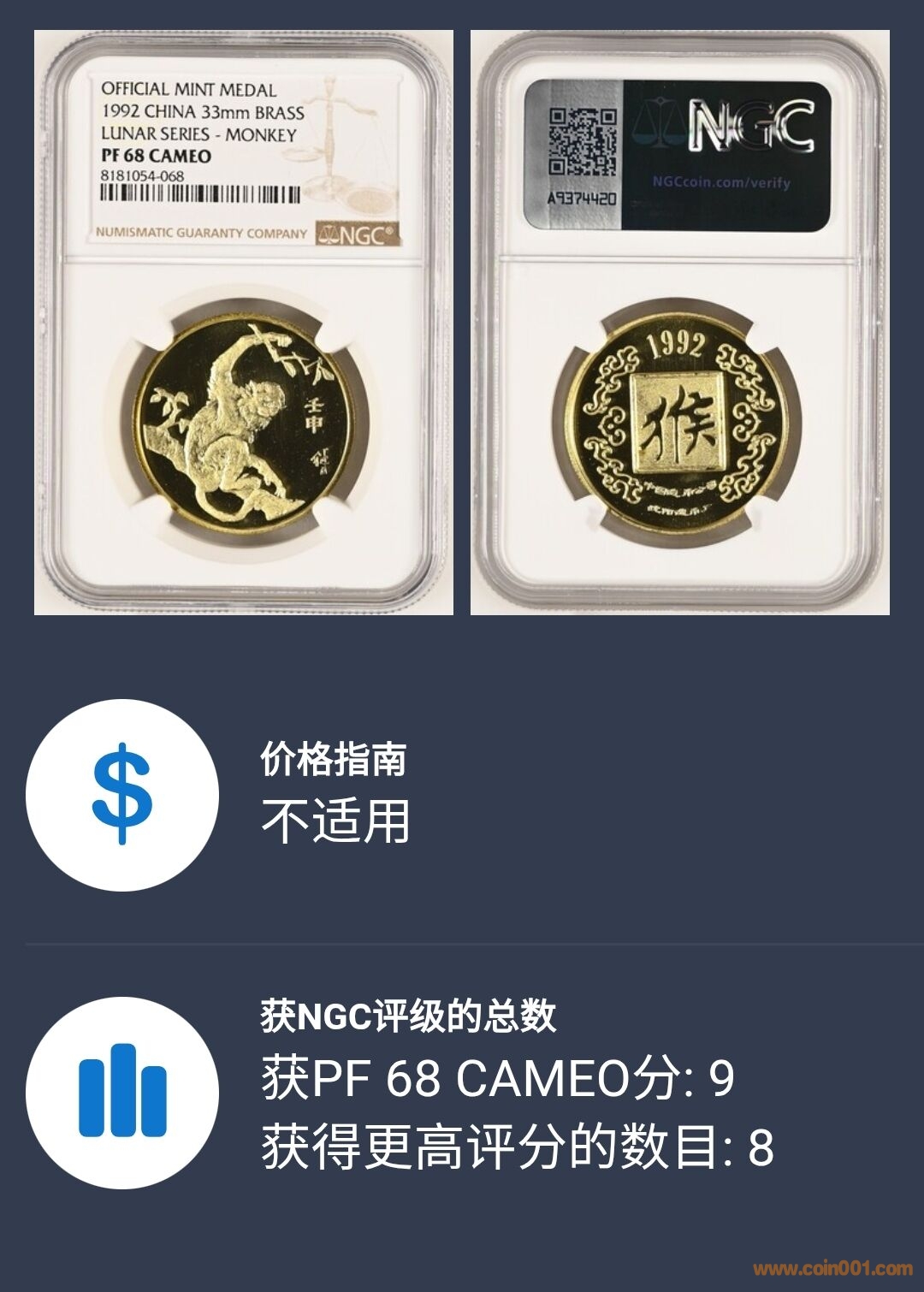 1992年猴年生肖銅章33mm,NGC PF68,亞軍分,更高分僅8枚 -380元