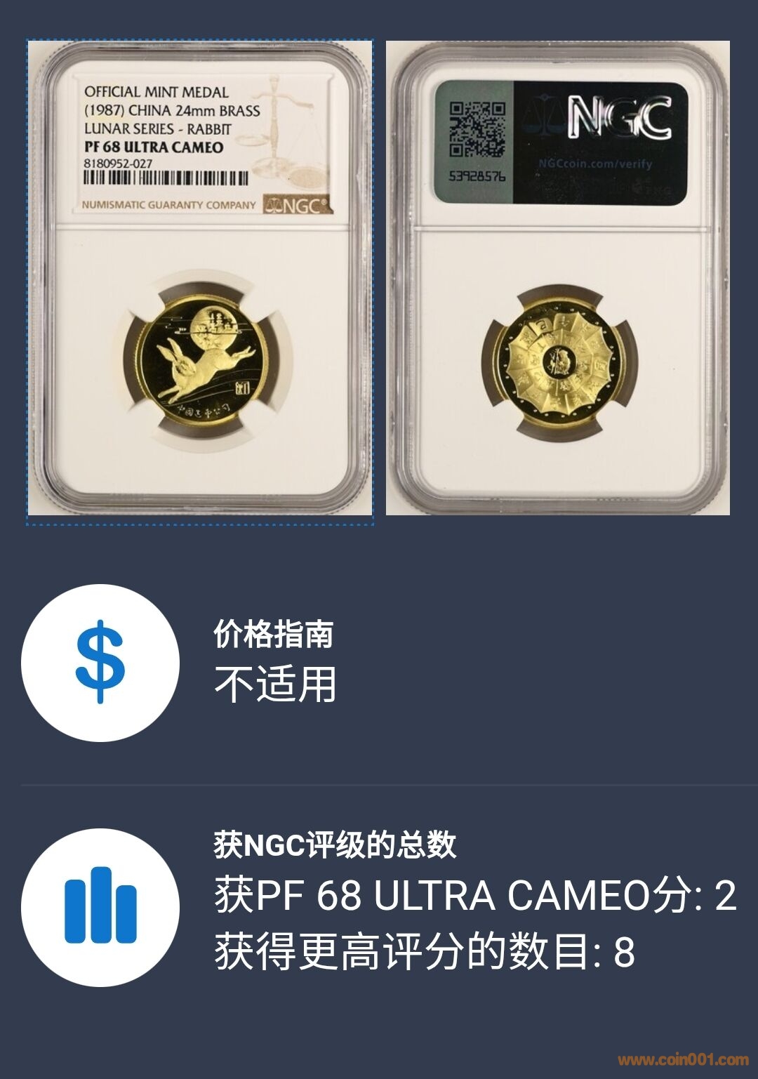 1987年生肖兔銅章24mm,NGC PF68,亞軍分,更高分僅8枚  -380元