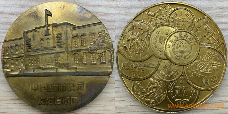 80年代沈幣制造,黃銅普制。正面為沈幣廠房,反面為疊幣圖案。此章后期疑似有紫銅仿品。