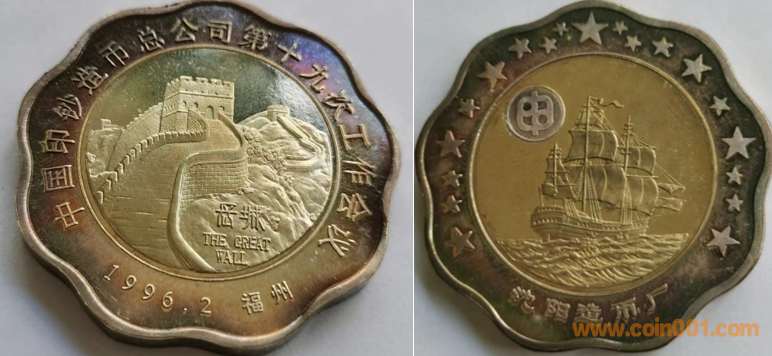 1990年上幣制造,紫銅上色。正面為國際造幣會議會徽,反面為熊貓疊幣圖案。