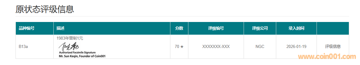 鑒于原狀態(tài)認(rèn)證工作耗時(shí)較長,孫老師精力有限,故送評的錢幣級(jí)別需在六級(jí)及以上(具體級(jí)別劃分請參照《中國現(xiàn)代流通硬幣標(biāo)準(zhǔn)目錄》第四版),網(wǎng)站將按照收到送評錢幣的時(shí)間先后順序進(jìn)行排隊(duì)處理,當(dāng)送評數(shù)量較大時(shí),網(wǎng)站保留隨時(shí)暫停接收此標(biāo)簽送評申請的權(quán)利。