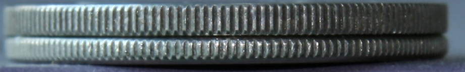 ??????早期銅鎳合金精制幣與普制幣的幣邊有區(qū)別,精制幣都是直角邊,普制幣是圓弧邊,以前的理論認(rèn)為,圓弧邊是倒角所致,精制幣幣邊不倒角。(見(jiàn)下圖)