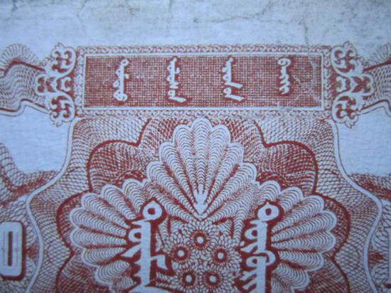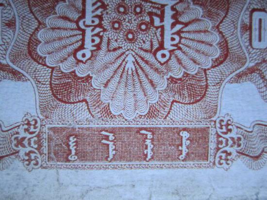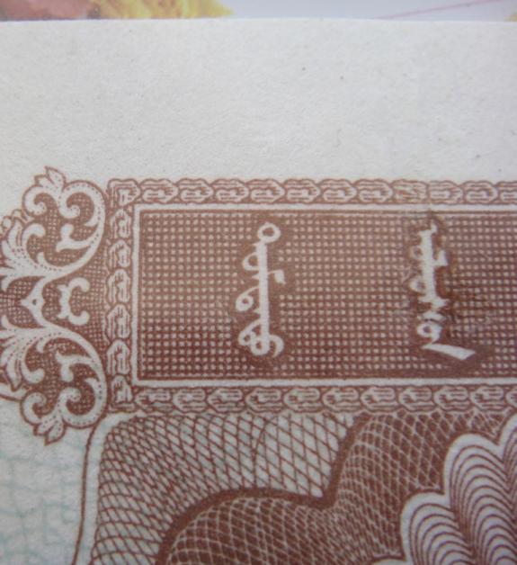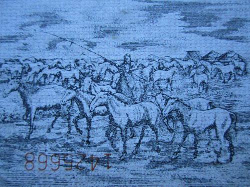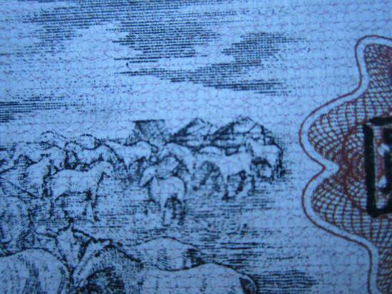 再看印刷細(xì)節(jié),真票放牧人的五官清楚,每頭馬的眼睛和鼻孔都清楚,鞭子是一條清晰完整的鞭子,這張都不清楚。再看紙張,這張紙近年的,不是老紙。