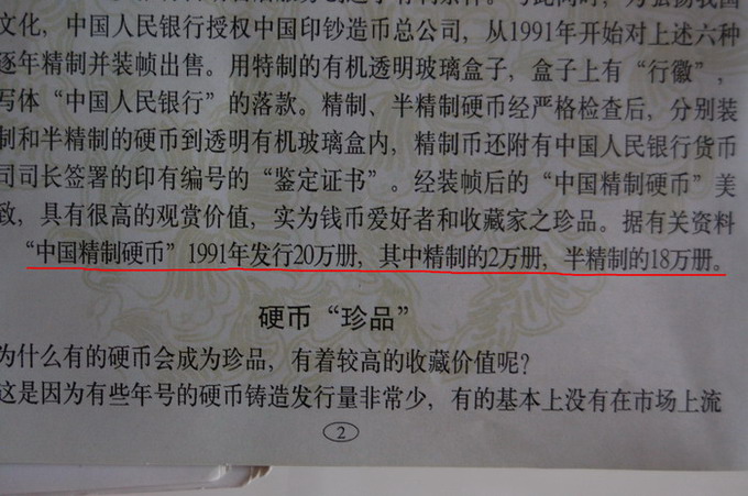根據(jù)最新版的《中國硬幣圖錄》記載,“中國精制硬幣”1991年發(fā)行20萬冊(cè),其中精制的2萬冊(cè),半精制的18萬冊(cè)。引文詳見(圖一)