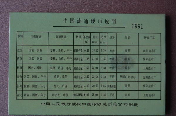 1.精制幣:發(fā)行量2萬,內(nèi)有1991年的1元,5角,1角,5分,2分,1分各一枚,裝幀成冊(cè)。詳見(圖二)。