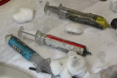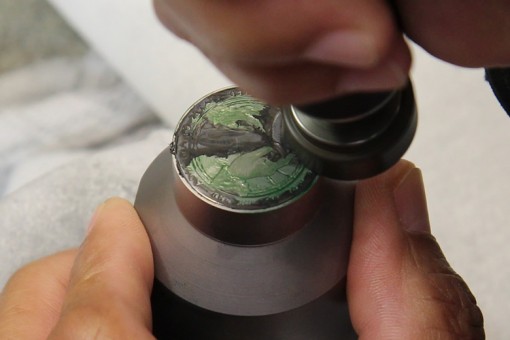 三種不同粒度的鉆石粉被用來拋光幣模。 Alberto 把鉆石粉研磨膏抹到精制幣的幣模上。一個品級的鉆石粉膏被手工抹到幣模上。在研磨膏和電動研磨頭的參與下開始了拋光過程。