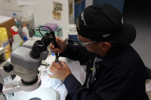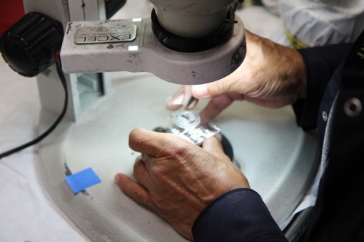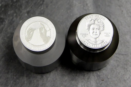 圖中,Ida McKinley 第一夫人精制金幣的背面幣模和 Helen Taft 第一夫人精制金幣的正面幣模即將進入拋光工序。Alberto 使用的工具包括透明膠、X-Acto 割刀、顯微鏡、鉆石粉膏和電動研磨工具。他向我們展示了如何手工拋光精制幣的幣模,以便把二級坯餅壓印成精制幣。精制幣不是用來花的,并不進入流通。它們專為收藏者制作,或者用來紀念某一人物、地方和事件。精制幣閃閃發(fā)光,它們突起的圖案帶有凝霜,而背景(底板)則有鏡面效果。