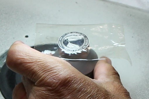 透明膠被用來手工遮擋幣模的圖案部分。圖中的幣模已經(jīng)拋光兩次,接著還要最后拋光一次。
