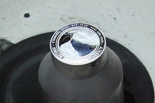 要獲得凝霜外觀,精制幣幣模的整個表面都要進行噴砂處理,方法是用一臺高壓噴砂機將細玻璃珠和氧化鋁的混合物圍繞著幣模形成漩渦。