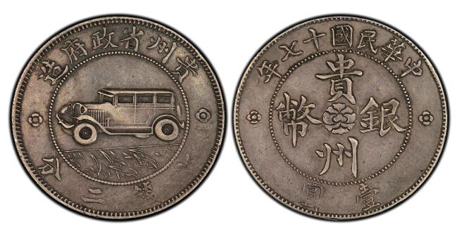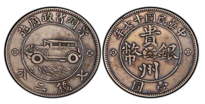 1928年,貴陽(yáng)至桐梓省道竣工通車,周西成特命貴州造幣廠鑄造發(fā)行貴州汽車銀幣以示紀(jì)念。該銀幣直徑39毫米,重26.2克左右,齒邊,成色在78%-79%之間,鑄量5萬(wàn)枚。正面上書“中華民國(guó)十七年”字樣,正中為“貴州銀幣”四字,中心為“芙蓉花”,下為“壹圓”;背面上為“貴州省政府造”,中間為在草地上行駛的汽車圖案,下邊為“七錢二分”字樣。草地由28片草葉構(gòu)成,寓示銀幣是1928年鑄造發(fā)行的;汽車前輪12根輻條,寓示一年12個(gè)月平安吉祥、如意發(fā)達(dá)。貴州汽車銀幣尤其引人注意的,是它與當(dāng)時(shí)流通使用的銀幣,有四個(gè)不同點(diǎn)一是有暗記。銀幣絕大多數(shù)沒(méi)有暗記,而汽車銀幣在圖案的草地中隱藏著由草葉構(gòu)成的“西成”兩字暗記。這是周西成的高明之處,既作了暗記,又通過(guò)這種方式使自己“名留后世”。 周西成是貴州桐梓縣人,貴州講武堂出身,1910年入伍。憑借個(gè)人才干,以足智多謀,果敢剛毅而得以平步青云,從最底級(jí)的士兵升至高位。1926年5月,34歲的周西成得任貴州省長(zhǎng),總攬了貴州軍政大權(quán)。同年12月,任國(guó)民革命軍黔軍后備軍總司令。1927年4月,任國(guó)民革命軍第25軍(黔)軍長(zhǎng),并任貴州省政府委員兼主席及南京國(guó)民政府軍事委員會(huì)委員。12月,任國(guó)民革命軍第九路軍總指揮。1928年5月,在與國(guó)民革命軍43軍軍長(zhǎng)李部爭(zhēng)奪省政戰(zhàn)斗中,周西成在黃果樹(shù)瀑布附近中彈身亡,年僅36歲。